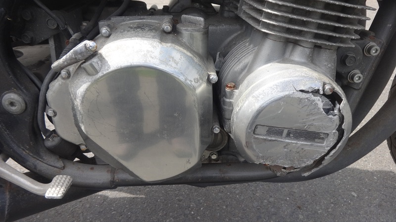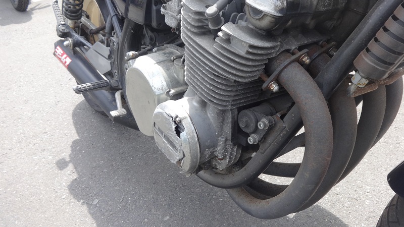 ヨシムラ製ショート管、他車種流用のリアサス、社外ヨーロピアンウインカーなどのライトカスタム車で、走行距離はメーター28753kmと比較的浅め。 ただし、古矢様が仰るとおりヤフオク取引の不動車であり、エンジン左上部の空冷フィンが激しく欠損、ジェネレーターカバーの大きなクラック、マフラーのエクボなど所々に事故の爪痕あり。