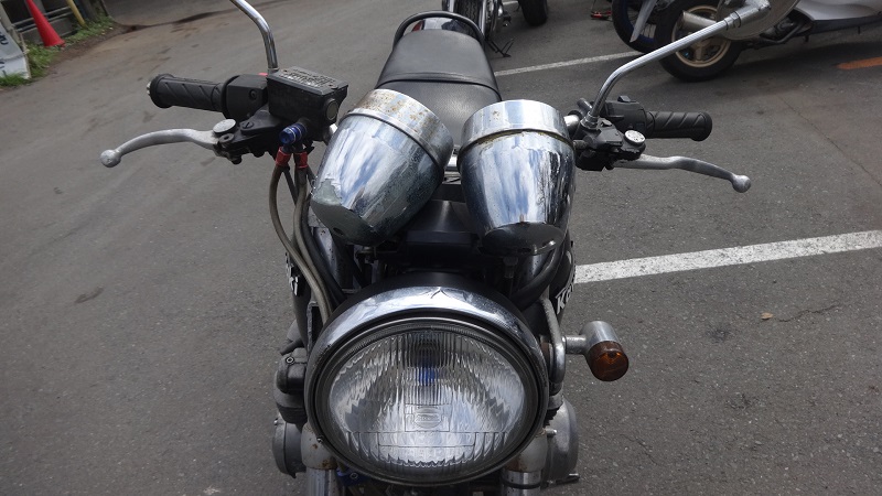 新品バッテリーでもセル自体が回らず、電装系もかなり難しい状態に陥っていることが明白でした。経年によるサビ・腐食も相当にあった上、フロントも正面から見ると微妙な歪みが発生。