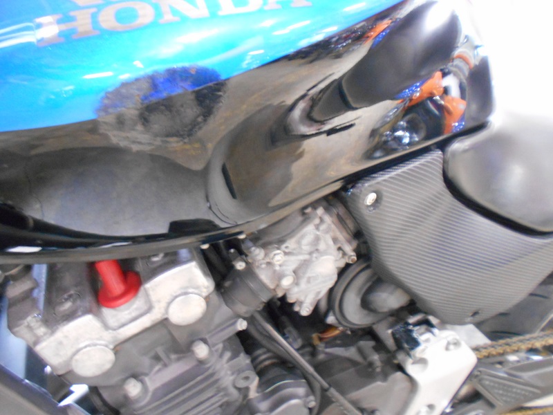 今回、査定をご依頼頂くきっかけとなったのはウインカーの不調でしたが、過去に2回低速でのスリップ転倒を起こしているとのことで、タンク両サイドにはエクボあり。(倒した際にタンクが凹みやすい車体形状をしているHORNETはタンクが凹んでいる個体の割合が最も高い機種の1つに挙げられます)