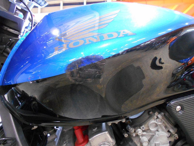 跳ね上がったマフラーに高回転型エンジンならではの直4サウンドと、ものすごく格好良さの詰まったバイクでしたが、タンクがボロボロに。。