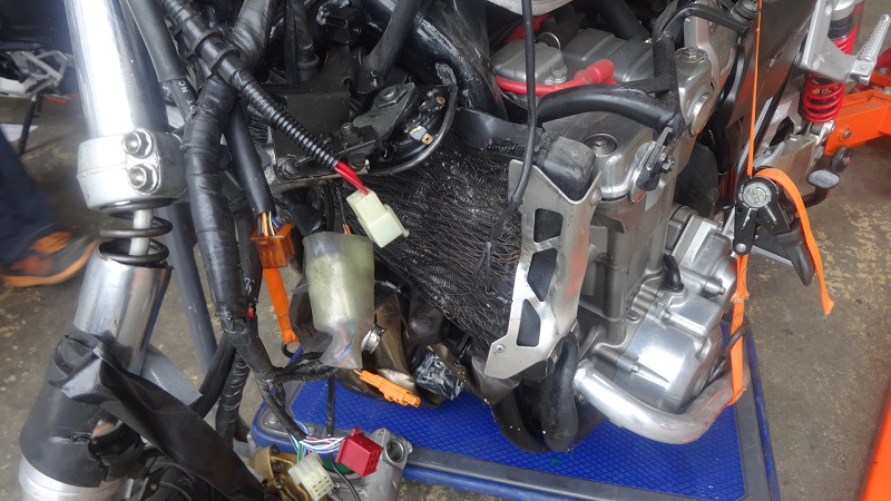車両状態は長期放置によって著しくくたびれており、納屋内の出入りで劣化したウインカーがステーの根元から折れるなど損傷多数。林道ツーリング後から寝かせっ放しとうかがっていた通り、 前後タイヤ溝の土砂詰まりや車体腹下のサビやキズ、金属部分の殆どに及ぶ腐食にフェンダー破損など、難を挙げればキリがないほど。前後サスのコシもすっかり抜けてしまい、 押し引き確認時はオフ車の絶対条件である剛性が損なわれ要オーバーホール判定。