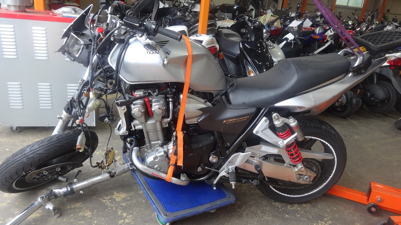 無料査定にお伺い致しましたのは蛙股行けにほど近いオーナー様のご自宅。オーナー様の愛車はHONDA大型車の旗艦モデルCB1300SB。フォークが折れて車体が分割されている全損事故車です。