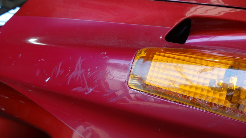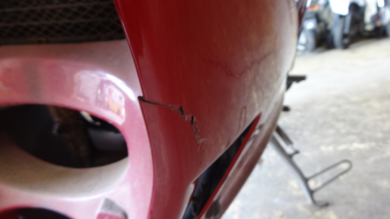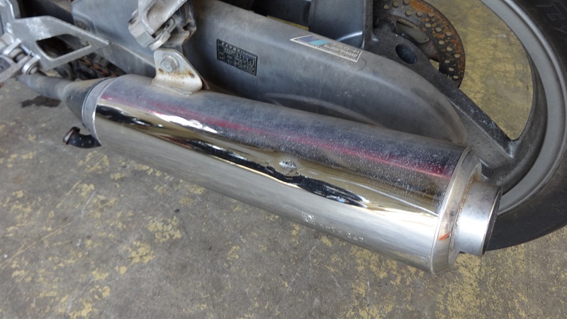 1年放置でバッテリーが上がりエンジンがかからないとことですが、ブースターを繋いでもセルは回るもののエンジンは始動しません。エンジン実働には2発のキャブレターの分解洗浄が必要となりそうです。タンク内のガソリンはまだ腐ってはおらずタンク内にも錆が浮いていなかったのは放置不動車としてはプラス評価です。カバーをかけて保管されていたので外装の色褪せは少なく色艶は悪くはありません。ただし、点錆の目立つインナーチューブなど足回りに錆びが目立つ他、外装カウルの各所には擦り傷や細かな割れも散見されます。