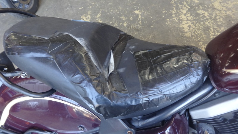 配線への影響こそなかったものの、要交換判定。シートも雨風と経年劣化で所々に避けており、応急処置のガムテープによりかろうじて中のクッション素材をガードしているという状況。