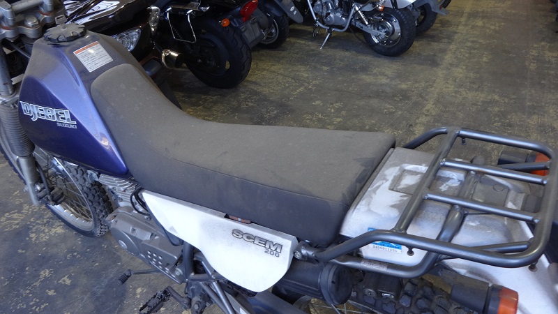 シートやタンクなど車体の上部に埃が積もっていたDJEBEL200。メーターは積もった埃でパネルが見えないほどです。しかしながら積もった埃が幸いし、車体に錆びは少なく外装の色褪せも目立ったものはありません。ピシューと水洗いすると3年放置されていた車体としては綺麗な姿が出現する様が目に浮かびます。