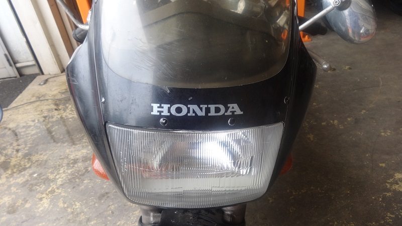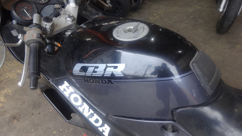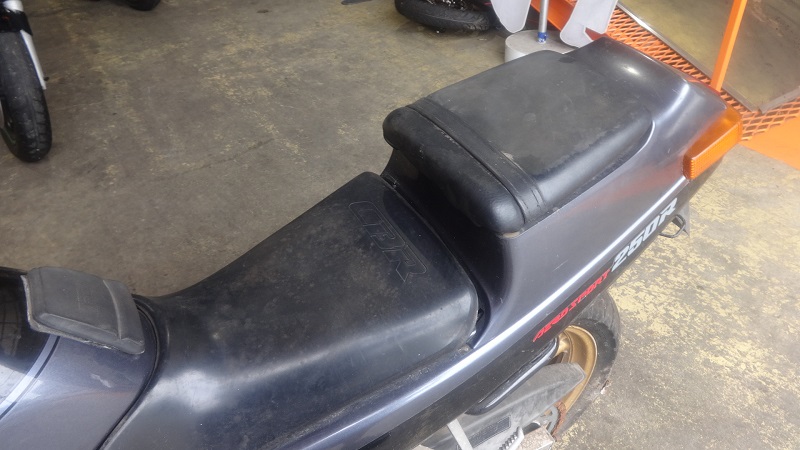 オーナー様の愛車は往年のレーサーレプリカCBR250R。初期MC17型の1987年モデルです。自主規制上限の45馬力を1.5万回転で発生させる高回転型のエンジンが特徴です。翌1988年には複眼の丸型ヘッドライトを纏ったMC19型にフルモデルチェンジされ、20年超の空白を経て2011年にMX41型の現行型へバトンタッチされています。