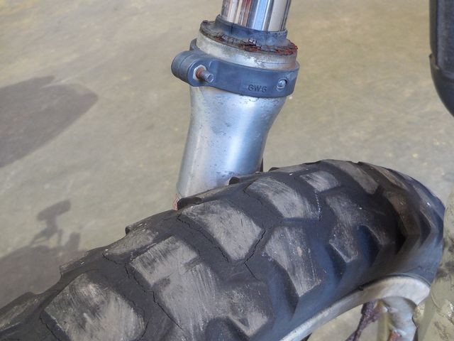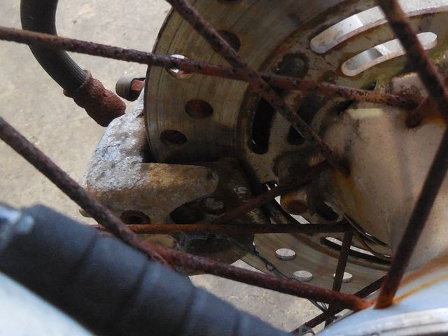 前後スポークホイール・ディスクブレーキへの腐食も著しく、特にブレーキキャリパーは腐食で覆われていています。ブロックがツルツルとなっているタイヤのゴムは劣化によってヒビ割れしております。