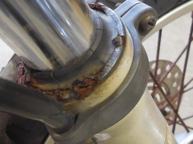 白く塗られたフレームには無数のサビが発生しており、車体のいたるところに下地や茶色い錆びが散見できる状態。