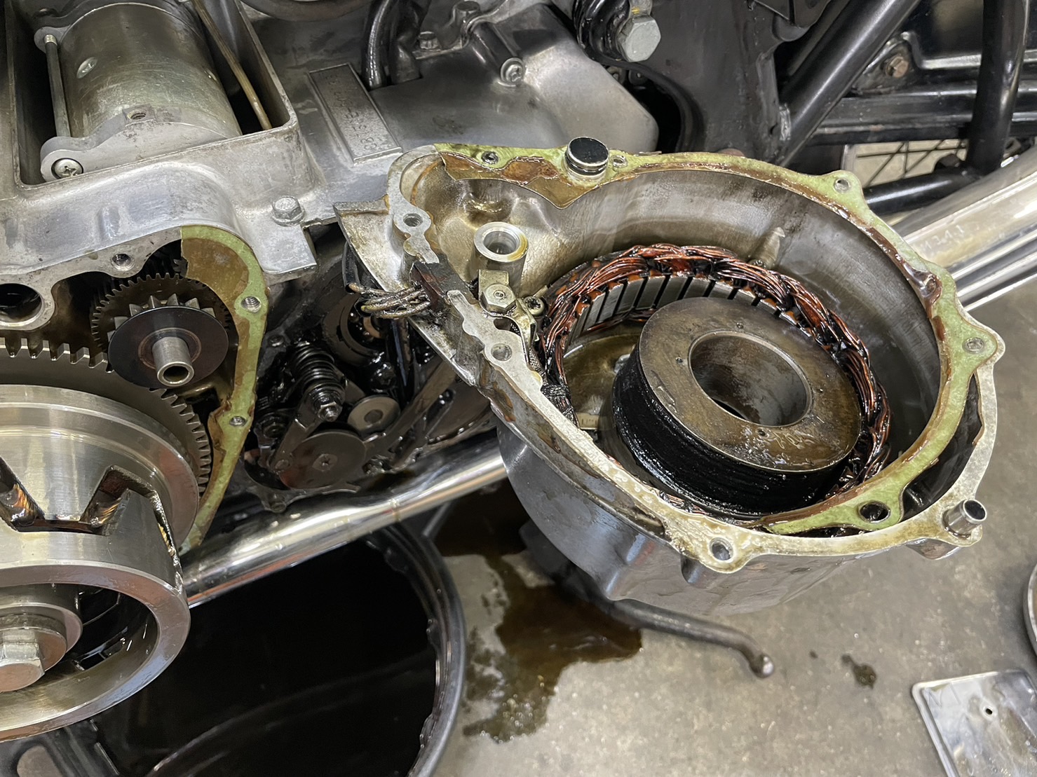 当時物の外装は比較的綺麗であった一方で、クランクケース内のワンウェイの劣化で機能しないセルスターター・エンジンを開けての要修理となった多量のオイル漏れ・要オーバーホール判定となったリアサスペンションなど 重整備を必要とする故障も目立ち、2023年現在の相場に照らすと115万円が利益ぎりぎりの査定額となるところ、日本一バイクを売っている弊社直営販売店での再販も視野に120万円で買取致しました事例です。