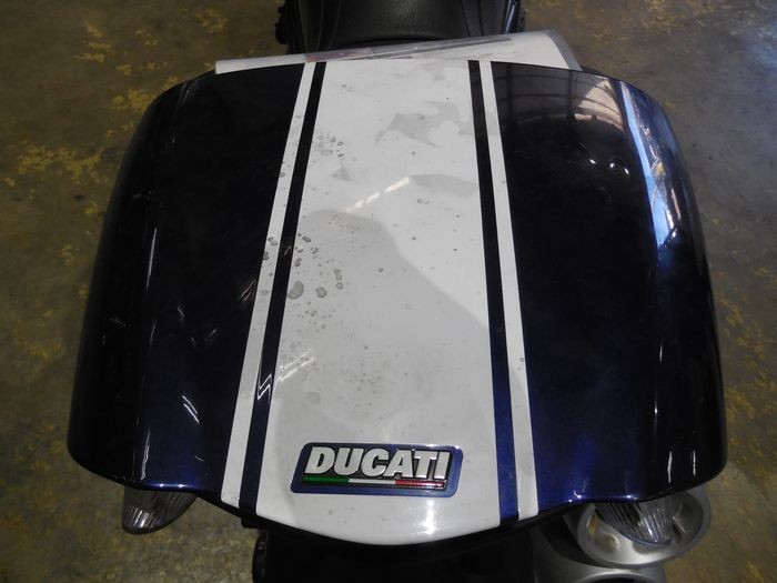 先ずは、車体の見た目の印象を左右する外装から査定していきます。 メタリックブルー/ホワイトストライプのカラーリングですが、日焼けなのか?本来の濃く輝く色彩ではなく、淡くくすんだ印象で本来の色艶を失っているようです。 査定させて頂く高年式のドゥカティは大切にされた極上車の比率がとても多いのですが、今回のディアベルはパッと見て「ややくたびれているな」と思わせる雰囲気がありました。