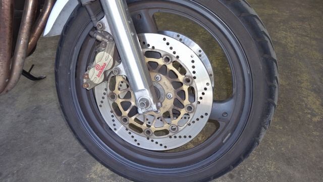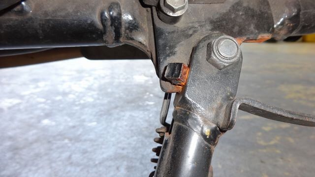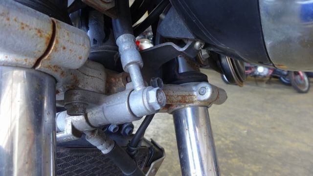 全体的に塗装ハゲや錆び腐食箇所が多く、転倒によるこけ傷・ヘコミ・曲りなども各所にありましたが、高年式で低走行のエンジン状態は軽い異音がありましたが比較的良かったこともあり、