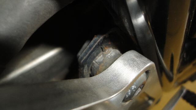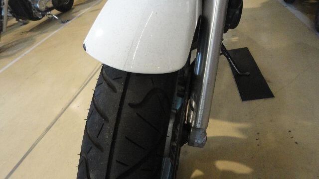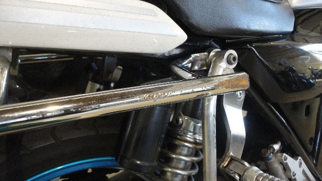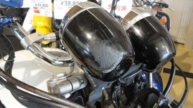 フロントから塀に衝突した事故車で、フロントフォーク・ステップなど曲がり、メーターやヘッドライト欠損、 ジェネレーターカバーやタンクなど転倒傷などが主なマイナス査定となった1994年式の事故車