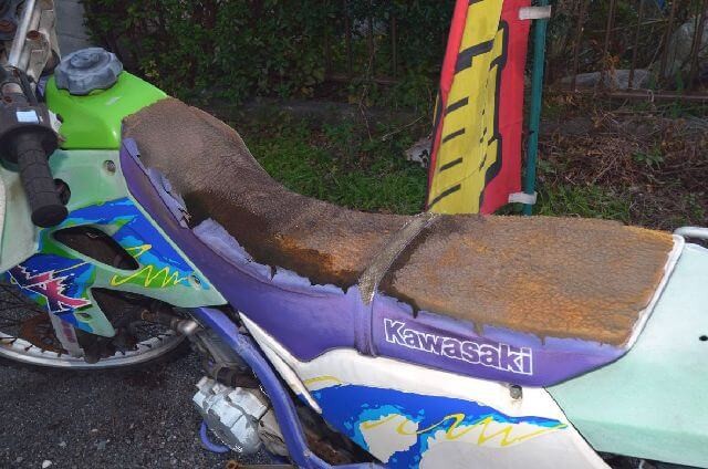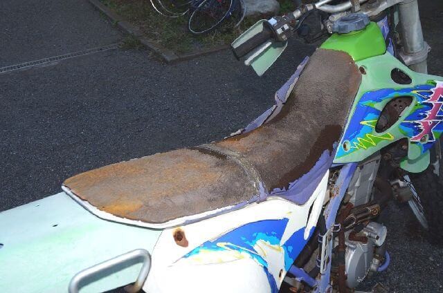 廃車処分のご依頼を頂いて無料での引き取り回収となったバイクは、水没して全損の不動車扱いとなった後も10年以上放置されていたため車体の傷みや劣化も激しい状態となっていた鍵なしの1998年式KLX250。