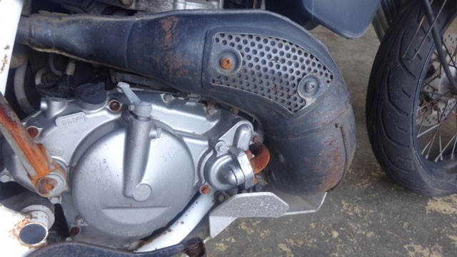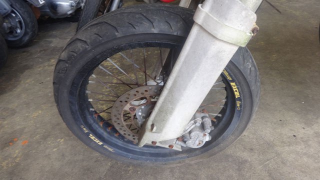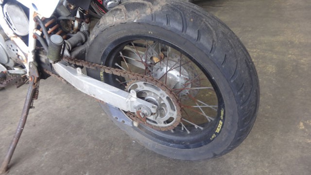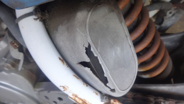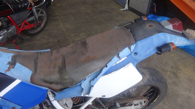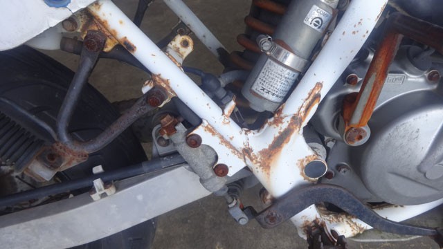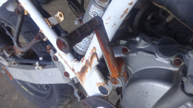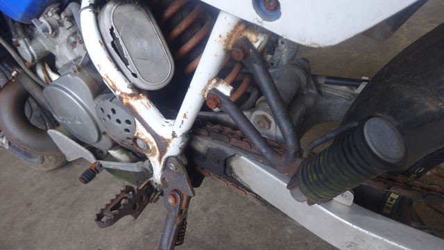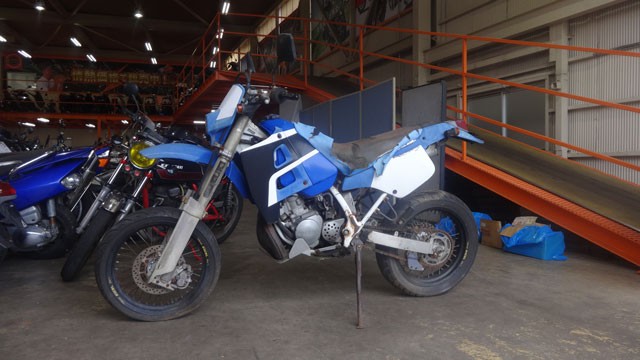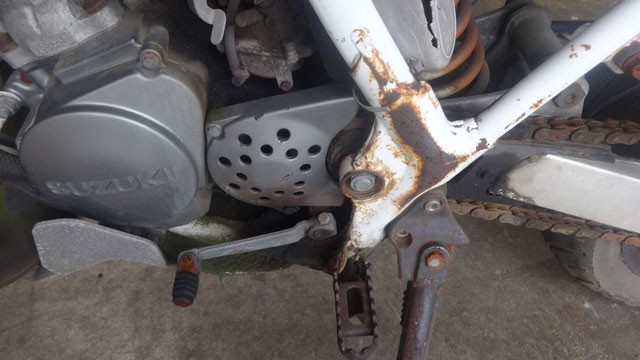 転がすのも一苦労するくらい足回りが不安定なTS200R そんな状態で他のパーツが良好なわけもなく、外装は色褪せてボロボロ割れ、タンク内の錆びが酷くエンジン実働化コストは少なく見積もっても5万円程度。しっかりと形は残っていましたが採算的に修理ベースに乗らず無料回収となってしまいました。