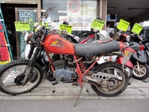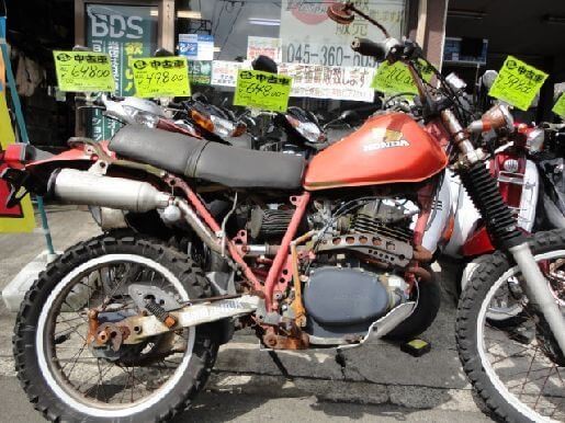 廃車処分のご依頼を頂いて無料での引き取り回収となったバイクは、9年放置で鍵無し書類なし、錆びや腐食など劣化が激しく一目見てスクラップ状態と認識できる1981年式XL250R