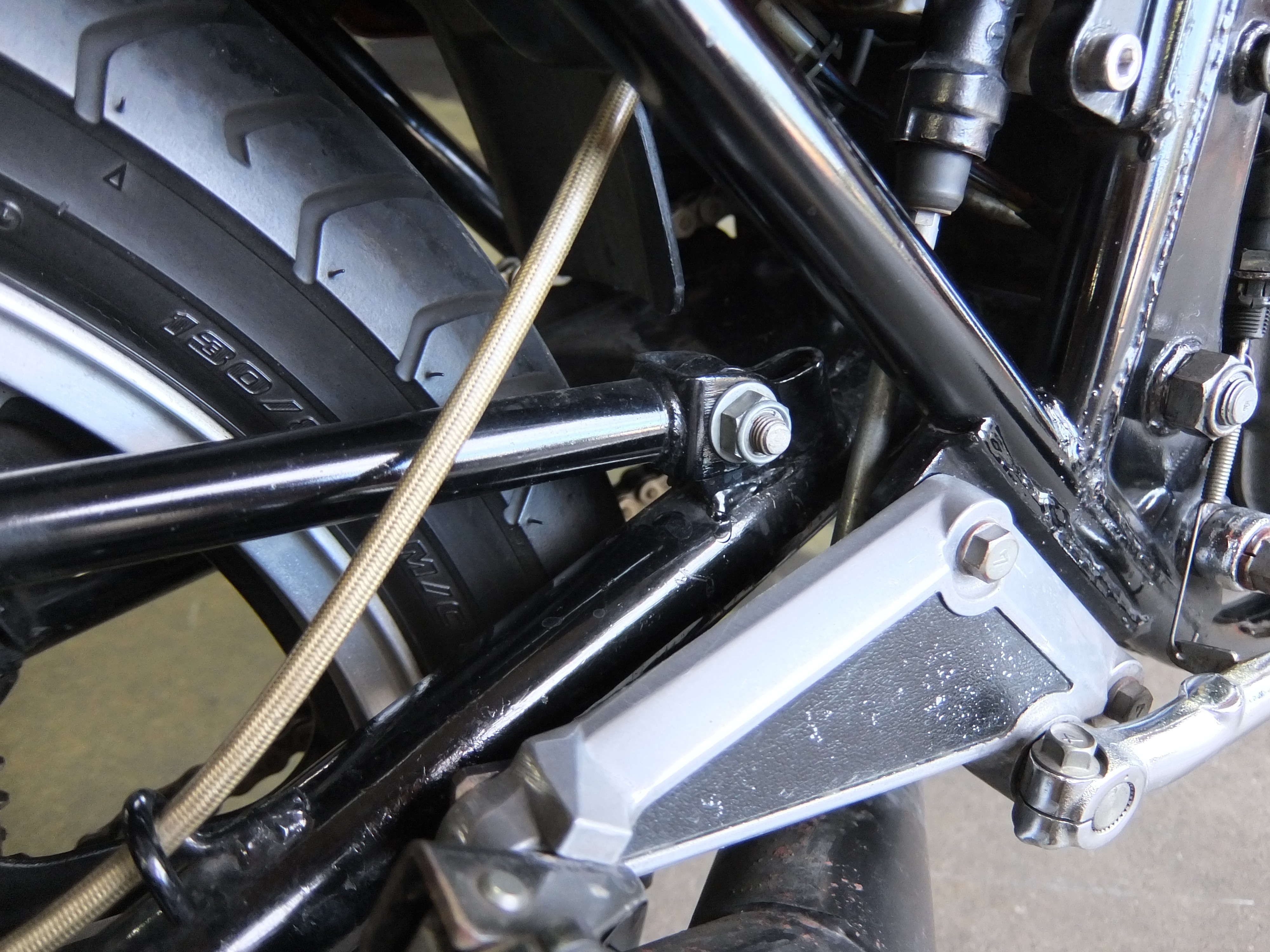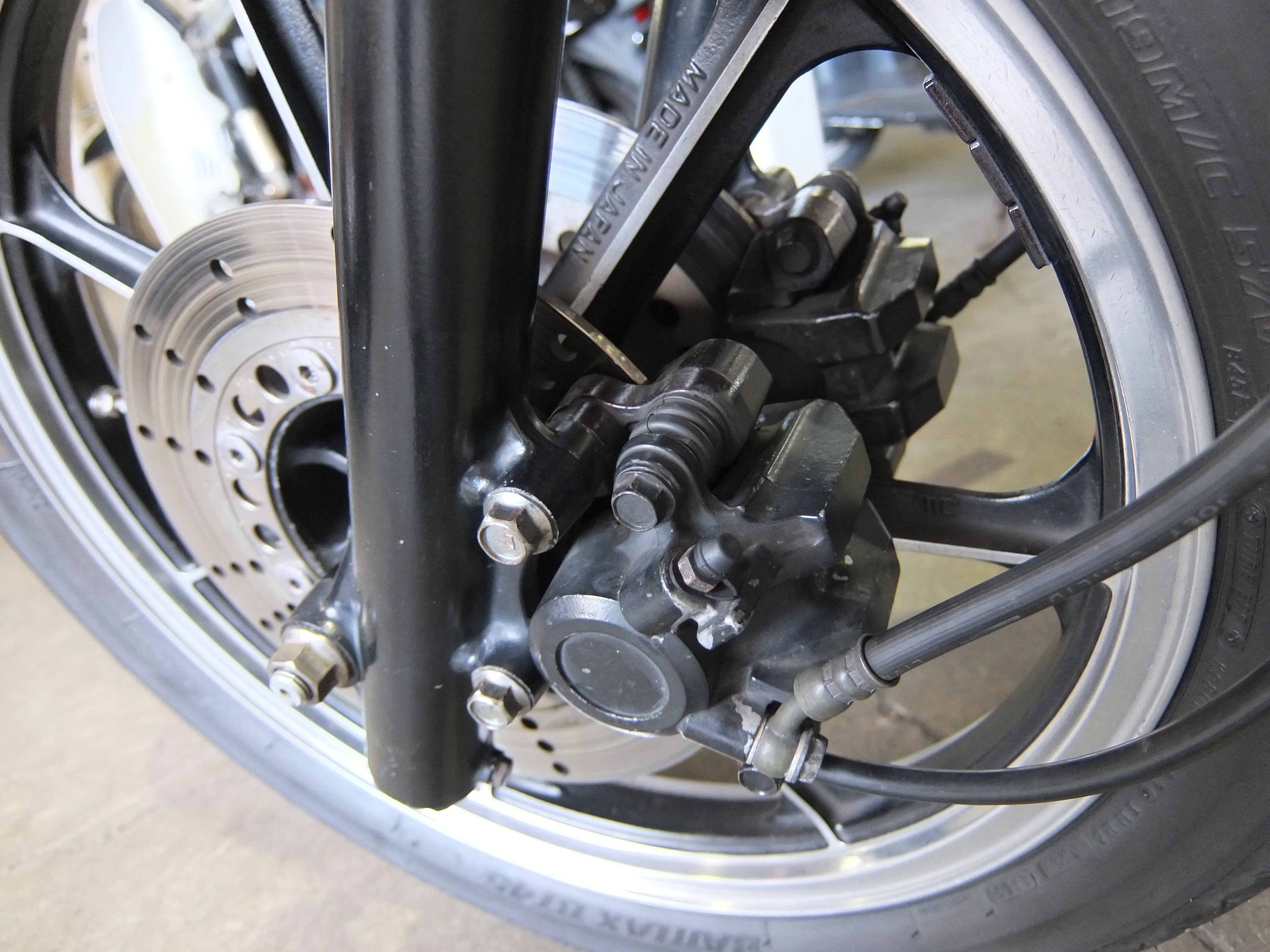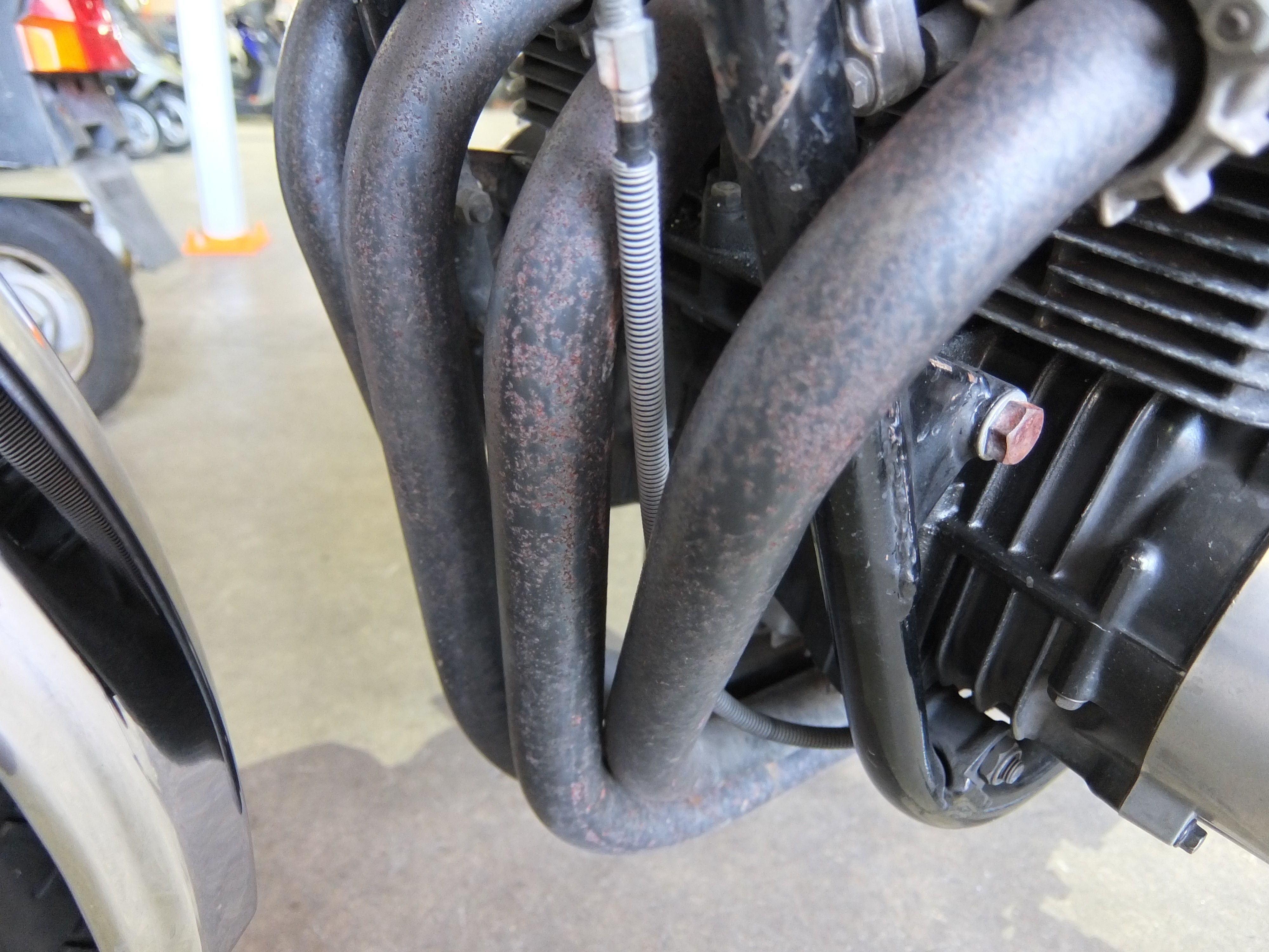 カスタム内容はマーシャル製ヘッドライト、フロントダブルディスク化、MRS製ショート管や社外ハンドルを装着。メーター読みでの走行距離は37,283kmとまずまず浅め。エンジンヘッドからは若干のオイル漏れが生じており、げのーな様の購入年月から考えても本格的な整備を検討すべき時期。