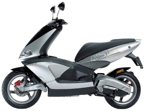 全長2,220mmのロングボディに、シート高810mmという125ccオフロード並みの高いシート高。乗りやすさが身上のスクーターモデルではあるものの、本機は前後13インチという大きめのタイヤを採用。同じ50ccクラスのNSR50が前後12インチということを踏まえると、本機が体格に恵まれたイタリア人向けに設計されたことを強く実感させられます。面と緩いカーブが描く大胆なデザインに加え、二灯式に見える一灯式ヘッドライト、250cc並みのロングホイールベースによる直進安定性、片手持ちタイプのフロントサスなど、どれを取っても国産スクーターそこのけの異端児。燃料タンク容量も11.5リットルという圧巻の大容量を誇り、人とは違う原付を探してる方にはうってつけの一台でしょう。その反面、本機の先代的な位置付けにあたるSR50と比べ、メンテナンス性はかなりの難点を抱えており、何をするにも大きなカバーを外す労力が必要。しかも安全性確保のため、ストッパーのビスが4点以上に上る箇所も多く、維持の面ではオーナーの努力が求められます。しかし、搭載されるミナレリ製エンジンのポテンシャルは非常に高く、スロットルの一捻りで軽々と60km/hオーバーの加速力を発揮。欧州仕様のハイギアードセッテングなため、本来のポテンシャルを発揮するには思い切ってスロットルを開ける必要がありますが、2ストエンジンならではの瞬発力はもとより、その加速力が3桁に迫るまで続くのは圧巻の一言。大柄な車体設計のため、居住性と自由性は十分以上のものがあり、腰高なシート高を活かして攻める走りも十分に許容範囲内。気合を入れて攻めるならハングオンすらも可能で、片手持ちフロントサスの挙動にさえ慣れてしまえば、ノーマル状態でもサーキット走行を楽しめるほど懐の深い一面も。路面からのギャップを殆ど感じさせない高剛性の足回りも含め、2ストスクーター特有の「速さ」と維持の手間隙を楽しみたい方のセカンドバイクとして面白い存在です。実はマラグーティ ファントム50と同じエンジンであり、両者は一種の異母兄弟的な関係であるとも言えます。