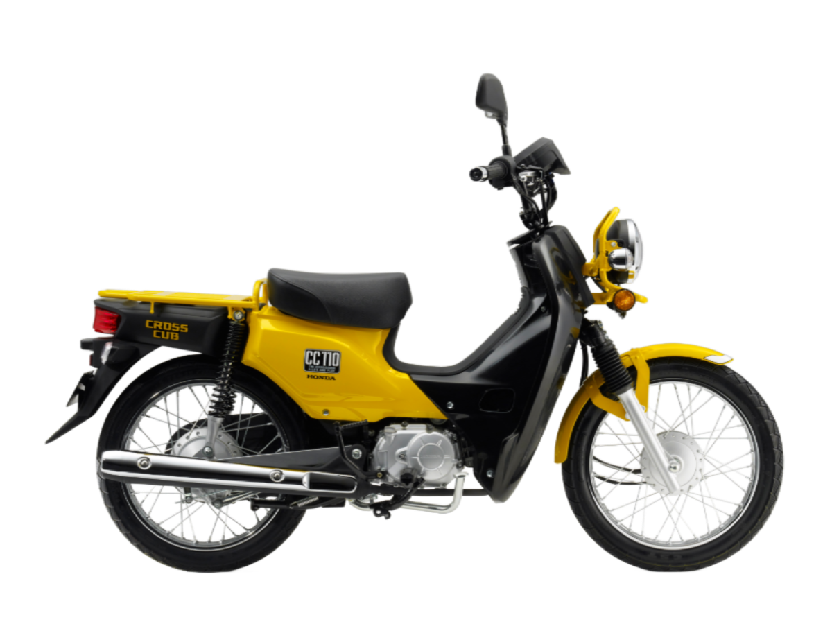 パールコーンイエローとファイティングレッド、2色の派手なカラーバリエーションもさることながら、ボディマウントしたガード付きのヘッドライトとレッグシールドが特徴的で、スーパーカブよりも気持ち大きめのシルエットも目を惹いた。