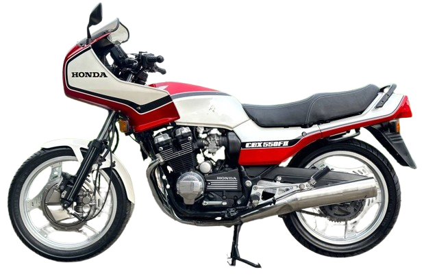 防風効果の高いカウリングと、前ダブル・後シングルのトリプルディスク化で400cc以上の運動性を有し、ワインディングから長距離ツーリングまで幅広くこなせる懐の深さが自慢の80年代空冷マシンのひとつです。CBX550F同様、最高出力60PSのパワフルな加速力と、フォークスタビライザーの追加で走行性能は高く、ロングライフシール付チェーンや大型ハロゲンヘッドライトなど装備面でも充実ぶりが目立ちます。カラーリングはブルー&ホワイトの1色設定のみですが、輸出モデルの方ではレッド&ホワイトが存在し、こちらは弟分のCBX400インテグラと同様のグラフィックパターンとなっております。当時のライバルにあたるのはカワサキ・Z550GP、ヤマハ・XJ550、スズキ・GSX550Fなどが挙げられます。