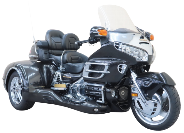 ゴールドウイングがトライク用に好まれる理由はいくつもあります。静かで振動の少ないエンジン、低速トルクの太さ(16.4kgf/4,000回転)、左右に張り出した見栄えするシリンダー、トライクに適した低重心、めっきパーツの多さ、大きなカウル、豪華シート、気品あるスタイリング、ノーマルでリバースシステムを装備している点などです。