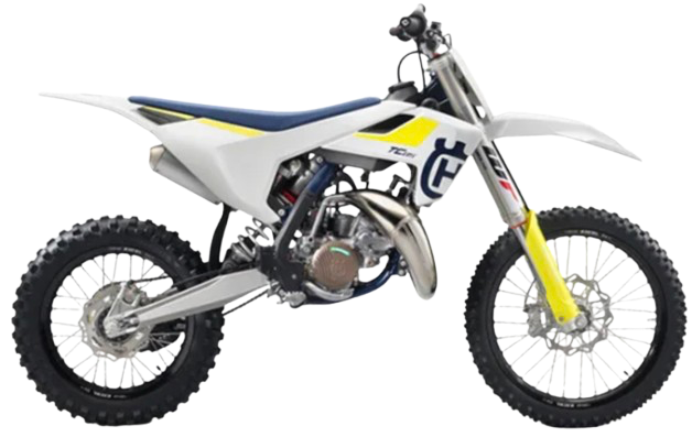 車名の「TC」が示す通り、TC250を始めとする水冷2ストロークエンジン搭載モトクロッサーTCシリーズの末弟となるモデルで、高負荷耐性と粘り強さに定評のあるクロムモリブデン鋼製セントラルチューブとフレームを基本骨格とし、タフさと軽さが要求されるモトクロッサーとしては最上級。兄貴分たちに採用された複合カーボンファイバー製サブフレームこそ与えられなかったものの、白地に鮮やかなイエローと深みのあるブルーで彩りを添えたスウェディシュカラーの外装類など、ビジュアルに関してはしっかりと継承。競技専用モデルという性質上、車体サイズは公表されていませんが、1,290mmという超ショートホイールベースが示す通り乗り手の意思と動きを瞬時に反映する俊敏さが持ち味。逆の見方をすると乗り手がサボると途端に動かなくなる車両特性ですが、ミニモトクロッサーとしては優秀そのもの。乾燥重量わずか69kgという軽さを実現しつつ、クロモリ製フレームによって高剛性をも両立したことによる強靭さはミニモトクラスでは他に類を見ないほど優れており、転倒などでのダメージも皆無に等しいレベルにまで軽減化できるのは特筆に値するほど。前後サスにはWP製の43mm径倒立式フロントフォーク、優れたダンピング性能を有するリアサスペンションを採用し、エントリーモデルながら手を入れる余地がないほどで、成人男子を背にジャンプを決めるにはやや頼りなさを感じさせるものの、それ以外の面では100点満点。剛柔のよさを併せ持った運動性能の高さに関しては、同クラスにおけるライバルとなるカワサキ・KX85シリーズと比べても遜色なし。むしろ乾燥重量にして8kgも勝る軽さは大きなアドバンテージで、キッズライダーにとっては理想を具現化した完成度の高いボディの持ち主だと言えるでしょう。