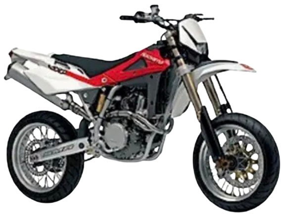 2004年 — SM450R 初期導入。水冷449cc単気筒、DOHC4バルブ、ミクニTMR系キャブレター採用。レースベースの軽量シャシーと倒立フォークを装備。