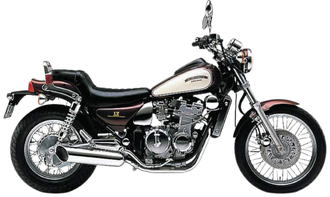 ‘86年に発売されたアメリカンドラッガーモデル、エリミネーター400をベースから400SEと400LXの2タイプに分かれ、各部パーツをブラックアウトしビキニカウルにキャストホイールと速さを求めたドラッガースタイルを強めた400SEに対し、スポークホイールを採用、各部にメッキパーツを施し、クラシックな雰囲気を強めた400LX。外観はクラシカルなクルーザー寄りになりながら中身はドラッガースタイルに恥じない走行性を持ち合わせたモデルだ。
