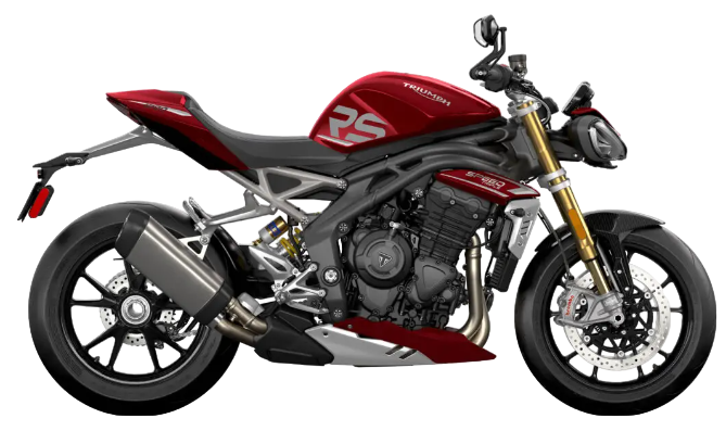 特徴的なフロントマスクで攻撃的な表情を創り上げる「ロードスター」カテゴリのハイパフォーマンスネイキッド「スピードトリプル 1200 RS」だが、2024年モデルではカラーチェンジが行われた。カラーバリエーションは、前年引き続き3タイプを設定するが、その内の1カラーが新色となっている。日本向けには、2023年7月に導入された。それぞれのカラーリングと価格は以下の通り。