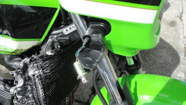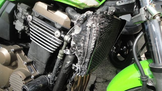 タンク・ラジエーターなど激しく変形している他、フレームや外装各所に目立つ転倒傷があり、一目見て損傷が激しいとわかる2005年式のZRX1200