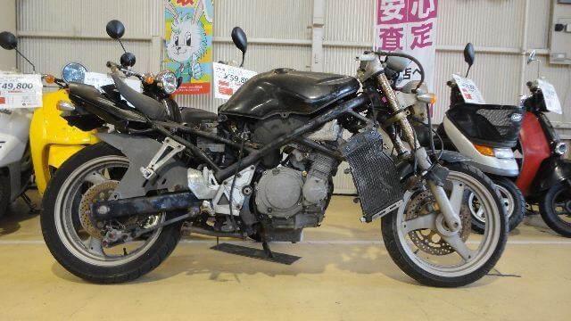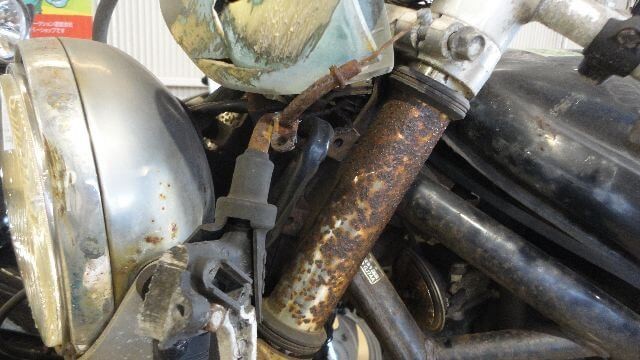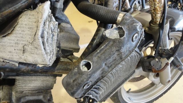 全損事故によって、フレーム・フォーク・タンク・外装などは全損、15年以上放置されていたためエンジンをはじめとする主だったパーツもすべて商業的な流通価値を喪失。どう頑張っても価値を見積もることが出来ず格安の処分費用を頂戴しての引取回収となりました。