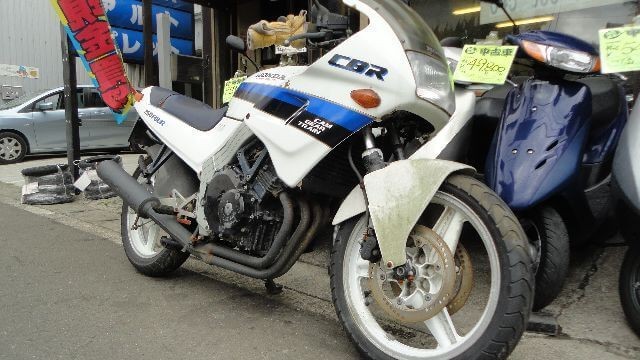 廃車処分のご依頼を頂いて無料での引き取り回収となったバイクは、長らく放置されていたため、腐食でタンクに穴が空いている程に劣化が激しい1986年式 CBR250FOURの不動車。