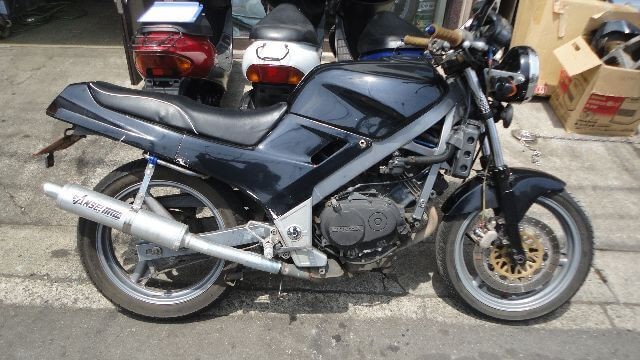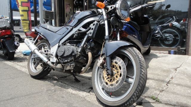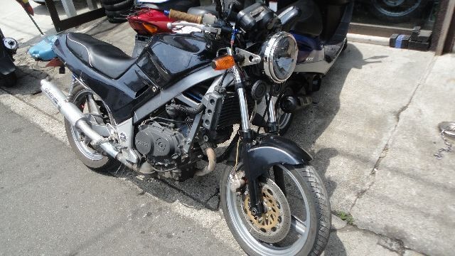 廃車処分のご依頼を頂いて無料での引き取り回収となったバイクは、追突事故によりフロントフォークがグシャリと曲がっている事故車のVTZ250。
