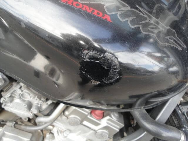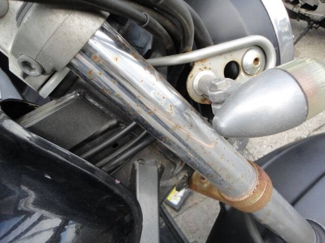 コケ傷の影響でタンクとマフラーに窪みがあり、チェーンやフロントフォークなど錆びの他全体的な使用感が目立ち査定価格がやや伸び悩んだ1996年式初期型MC31-100。