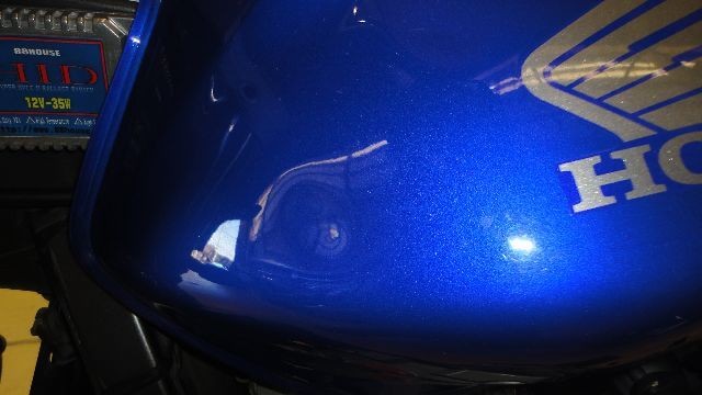 コケてタンク左側に4cm程度のへこみの他細かい傷あり、局所的にエキパイの錆びが非常に目立ち、細かいところにも錆びが各所にありますが、年式を考えると色褪せや劣化は少なく全体には綺麗な2003年式