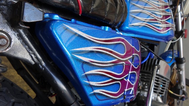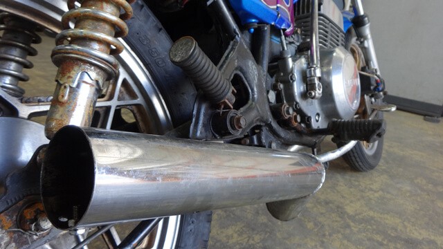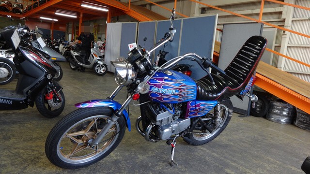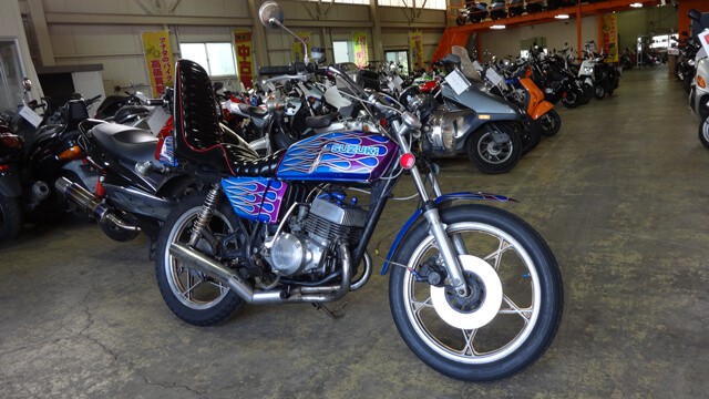 スズキ【RG250E】ド派手なペイントに3段シート・絞りハンドルに集合チャンバーと旧車會仕様に改造カスタムされた1980年式を25.8万円の査定額で買取致しました事例のご紹介。