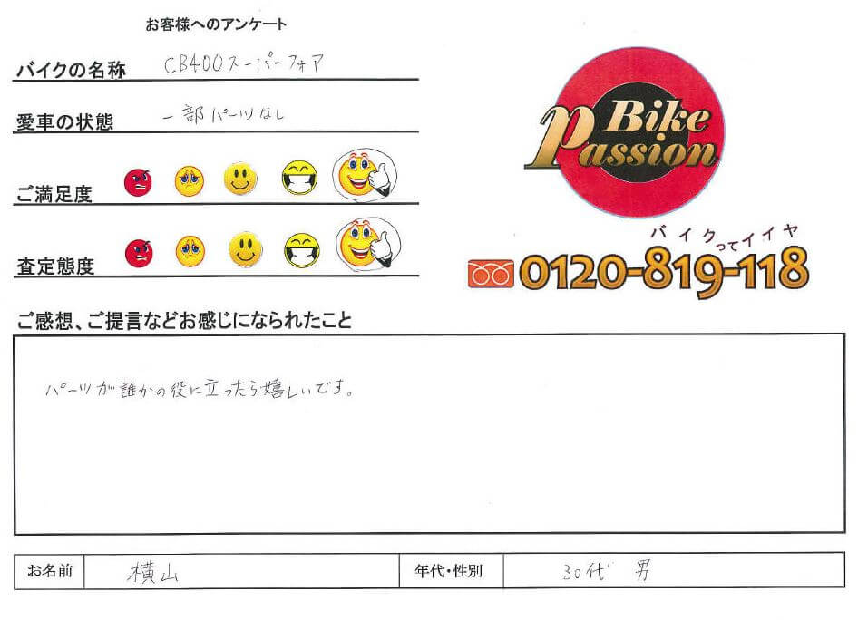 バイク買取査定をご利用くださいましたお客様より頂戴しましたアンケートと、 査定の際に御伺いさせて頂きました感想や評判・評価などお客様の声をご案内いたしております。