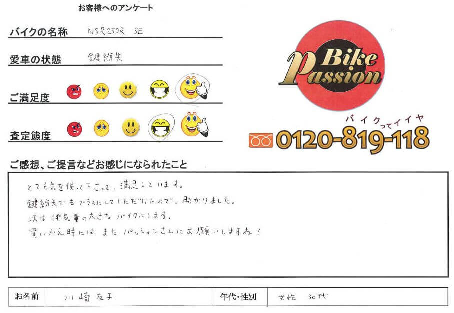 バイク買取査定をご利用くださいましたお客様より頂戴しましたアンケートと、 査定の際に御伺いさせて頂きました感想や評判・評価などお客様の声をご案内いたしております。