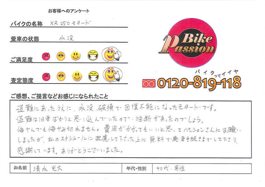 水没バイクで欠品多数のボロボロを無料で引き取って頂いて、川中からトラックに積み込むのに10分ほどかかり非常に助かりました。